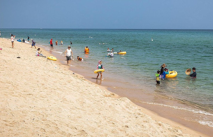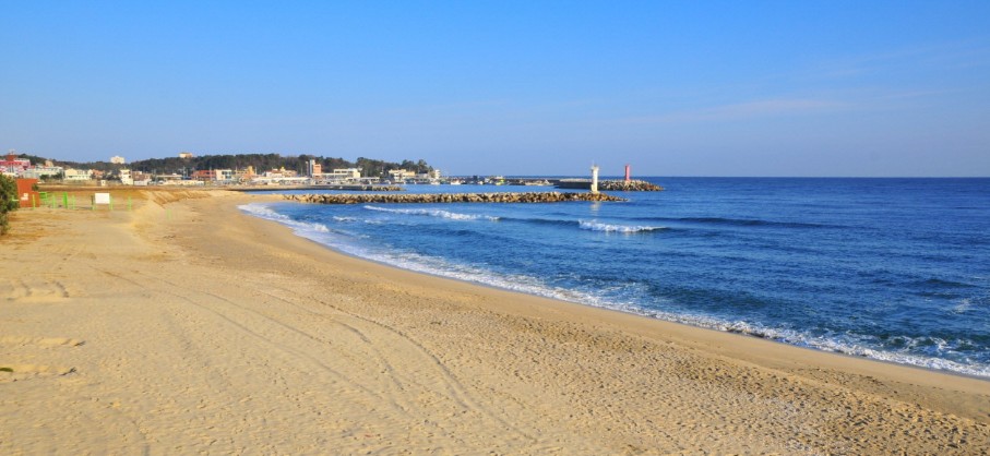 깨끗한 백사장과 맑은 바다가 투명한 햇살 아래 밝게 빛나고 해안가 뒤쪽으로 바닷바람을 맞으며 군락을 이루고 있는 솔밭길이 있어 산책을 즐길 수 있습니다. 이제 막 수영을 배우기 시작한 어린이들에게도 부담이 없는 잔잔한 파도와 바다새들이 있어 여름철 많은 피서객이 운집하고 있는 해변 중 하나입니다.