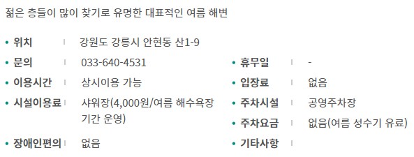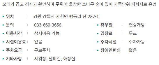 동해바다의 고운 모래가 깔린 모래사장에서는 모래를 갖고 창작품을 만들어 볼 수 있으며 미풍이 불어오면 탁 트인 모래사장에서 연을 날려 볼 수 있습니다.(내용출처 : 강릉관광개발공사)