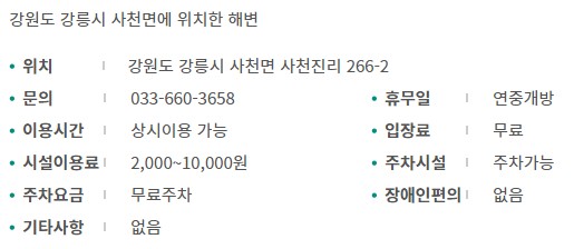 사천 해변은 경포대 해변과 연곡 해변 사이에 있는 길이 300m, 18,000㎡의 매우 조용하고 깨끗함을 자랑하는 해변이다. 1975년 7월 1일 개장되었으며, 경포도립공원과 인접해 있어 매년 많은 피서객이 찾고 있다. 해송숲이 넓게 우거져 있고 깨끗한 백사장과 얕은 수심으로 조용하게 피서를 즐기기 좋은 곳이다. 조용하고 소나무 숲에서 풍겨 나오는 향긋한 냄새와 시원한 그늘은 깊은 추억을 만들기에 더욱 좋다.(내용출처 : 강릉시)