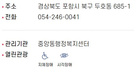 샤워장, 탈의장, 무료 야영장, 무료 주차장 등의 편의시설이 갖추어져 있습니다. 포항 여객터미널에서부터 북쪽으로 해변을 따라 음식점 및 유흥시설이 들어서면서 항상 사람들로 붐비며, 지역 사람들의 산책 코스로도 이용되고 있습니다.