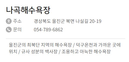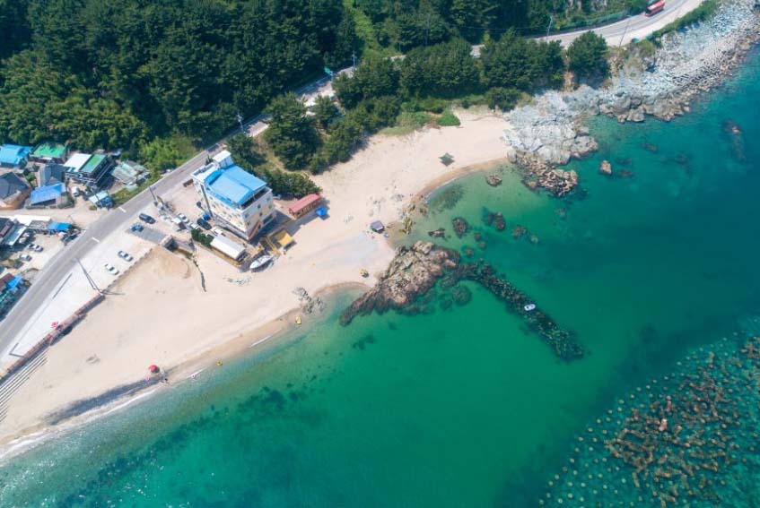 강구면과 축산면 사이의 해변도로에 있으며 블루로드 B코스'푸른 대게의 길' 중 한 코스입니다. 동해 바닷가 해수욕장 가운데 규모에 비해선 꽤 많은 관광객들이 찾아오며 바다 본부도 형성되어 있습니다. 수심이 낮고 바위들로 어우러진 자연경관을 갖춘 갯마을의 간이해수욕장으로 해안선이 보트 타기에 유리하여 다양한 보트를 볼 수 있습니다.