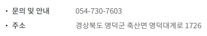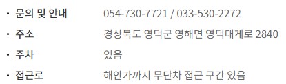 또 해수욕장 내에 샤워장, 화장실, 급수대, 매점, 주차장 등의 편의시설이 잘 갖추어져 있어 이용하는 데 불편함이 없습니다. 해안도로를 따라 즐기는 해안 절경과 고래불 해수욕장에서 7번 국도를 타고 북쪽으로 쭈욱 달리면 동해안의 유명한 관광지는 거의 다 돌아볼 수 있는 하나의 드라이브 코스가 됩니다.