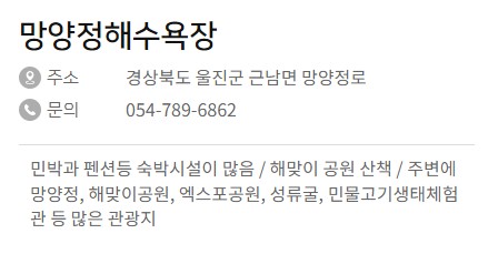 크고 작은 갯바위가 한적한 바다와 어우러져 아름다운 풍경을 뽐내고 있습니다. 해안 근처에는 민박촌이 많이 형성되어 있고, 야영장이 있어 텐트 사용도 가능합니다. 해수욕장에서 20분 정도 떨어진 거리에 온천으로 유명한 덕구온천이 있어 해수욕한 뒤에 따뜻한 온천물로 피로를 풀기에 제격입니다.