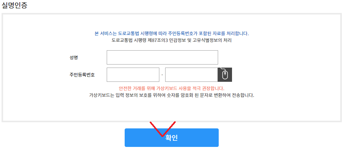 국제운전면허증을 클릭하면 본인 실명인증 하기 창이 열립니다 이름과 주민번호를 기록하고 확인을 클릭합니다.