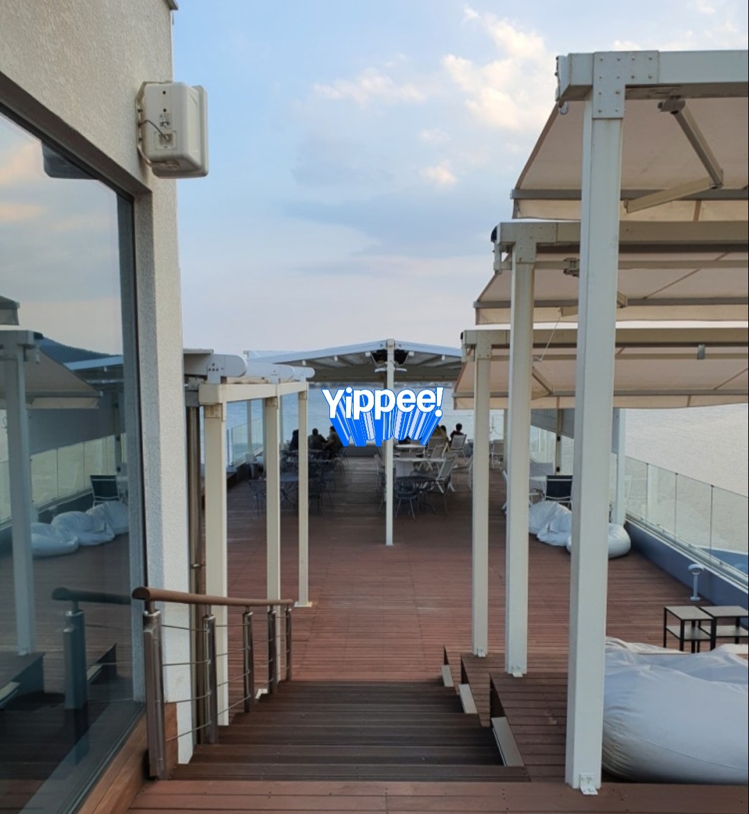 마리솔은 4층 규모의 대형 건물로, 전면 통유리를 통해 탁 트인 바다 전망을 감상할 수 있습니다. 특히 루프탑은 바닷바람을 맞으며 여유로운 시간을 보내기에 안성맞춤이며, '천국의 계단' 포토존은 인생샷을 남기기에 좋은 장소입니다. 단, 4층 루프탑은 안전상의 이유로 노키즈존으로 운영됩니다.