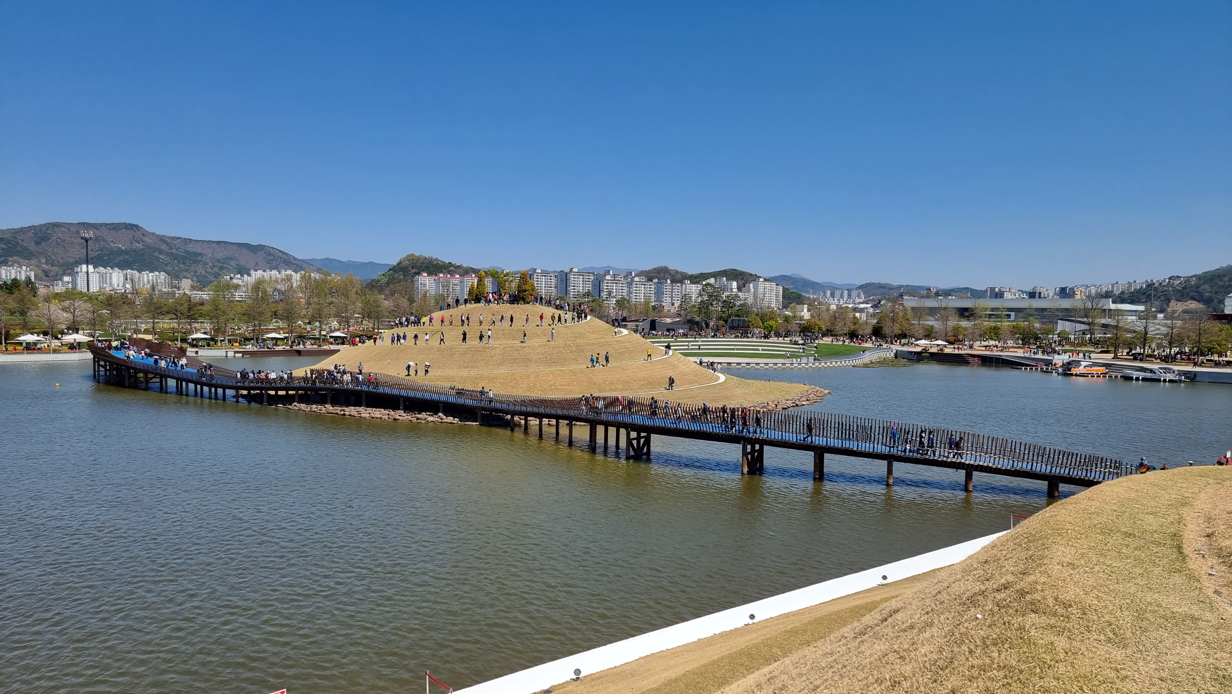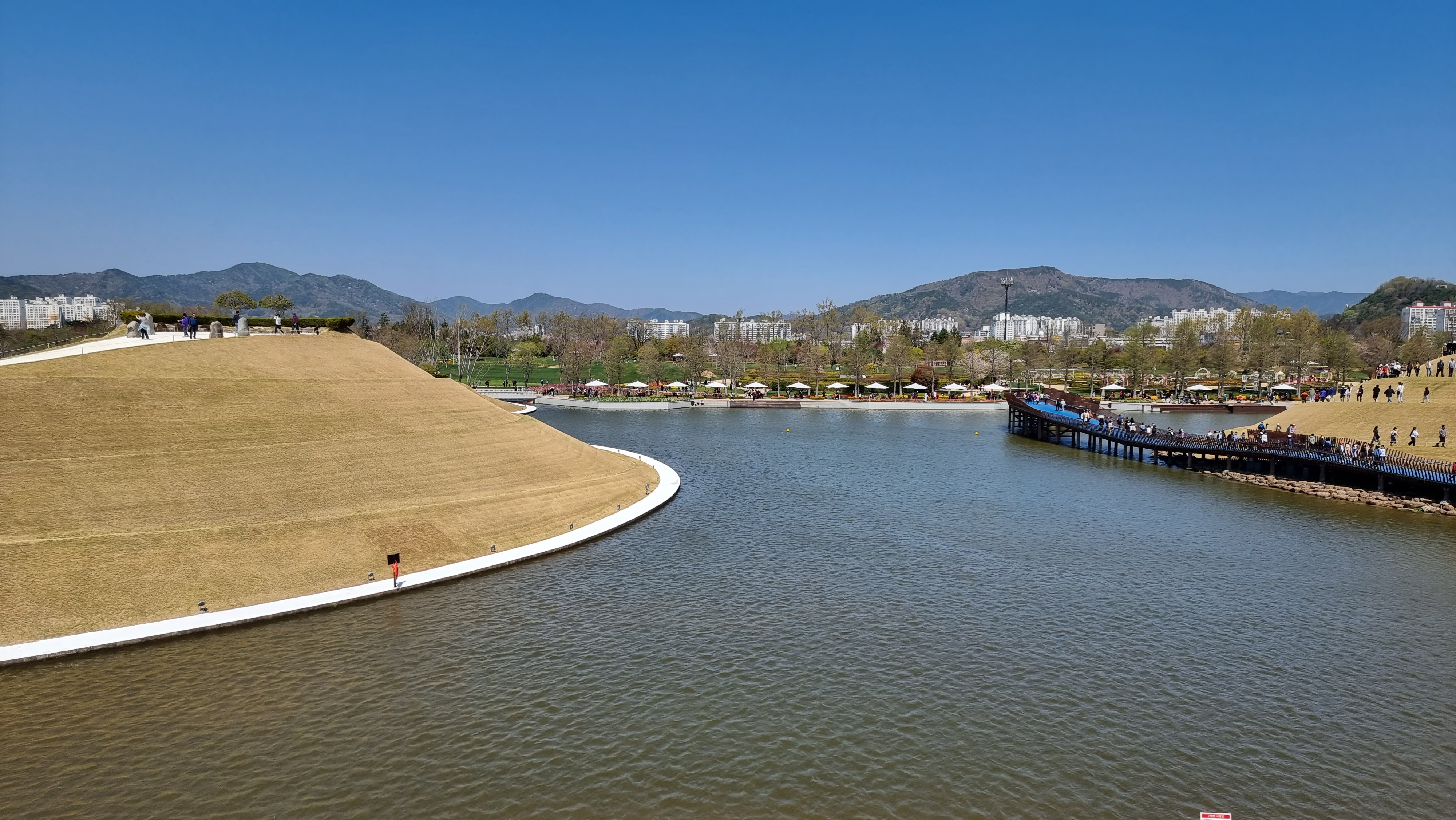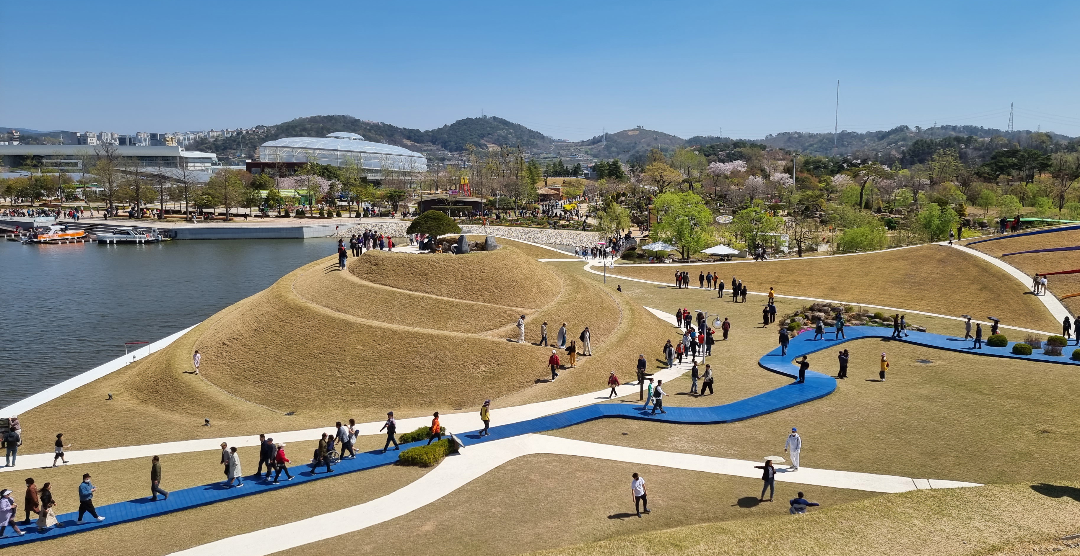 차가 달리던 아스팔트 위에 광활한 잔디길 조성 국가정원과 저류지, 동천을 하나로 연결 차량보다는 자연과 사람을 먼저 생각한 정원박람회의 상징적 공간