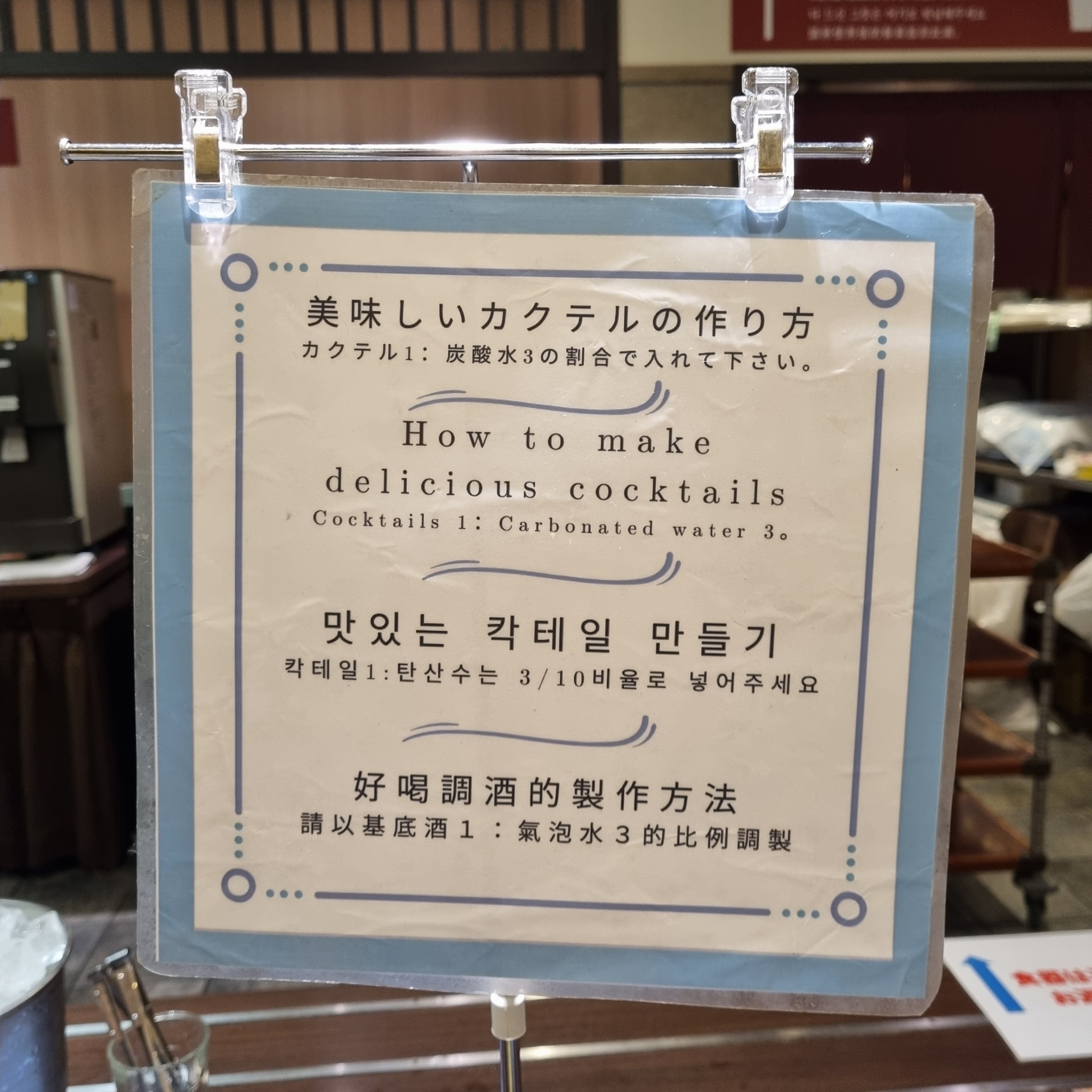 히노데 호텔은 오후 13시 부터 10시까지 모든 종류의 주류가 무료로 제공됩니다. 주류의 종류에는 생맥주, 하이볼, 사케, 칵테일, 위스키 등이 무료로 무한 제공 됩니다.