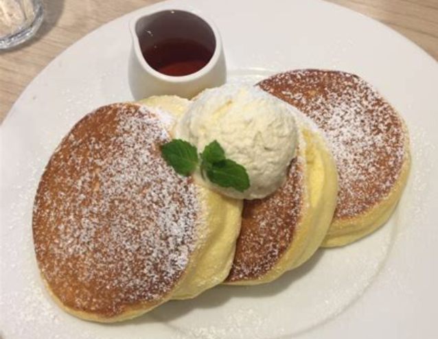 '시아와세노 팬케이크'는 팬케이크는 두툼하고 푹신한 식감이 특징이며 입안에서 사르르 녹는 부드러움을 자랑합니다.