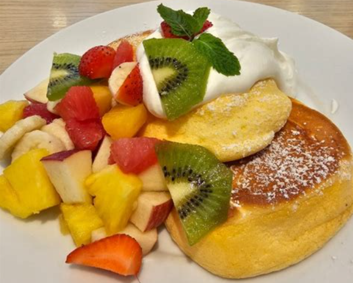 - 과일 토핑 팬케이크: 신선한 계절 과일이 풍부하게 올라가 있어 달콤함과 상큼함을 동시에 느낄 수 있습니다.