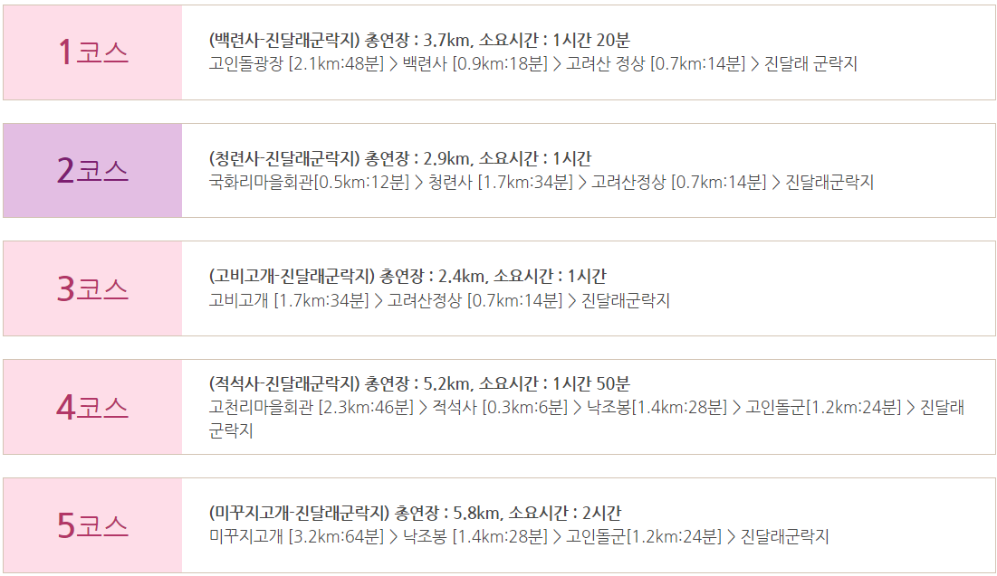 - 고인돌공원 임시주차장에서 고려산 정상(진달래군락지)까지 1시간 20분 정도 소요