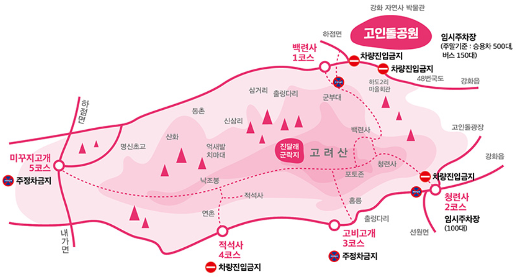인천 강화 고려산 진달래축제는 매년 4월이면 고려산 전체를 아름답게 물들이는 진달래가 장관을 이루는 시기에 고려산 일원에서 열립니다. 대표적인 고려산 진달래 산행 코스에는 백련사코스와 청련사코스가 있습니다. 그중 약 1시간에서 1시간 30분 정도의 추천코스인 아름다운 청련사코스를 알려드리겠습니다.