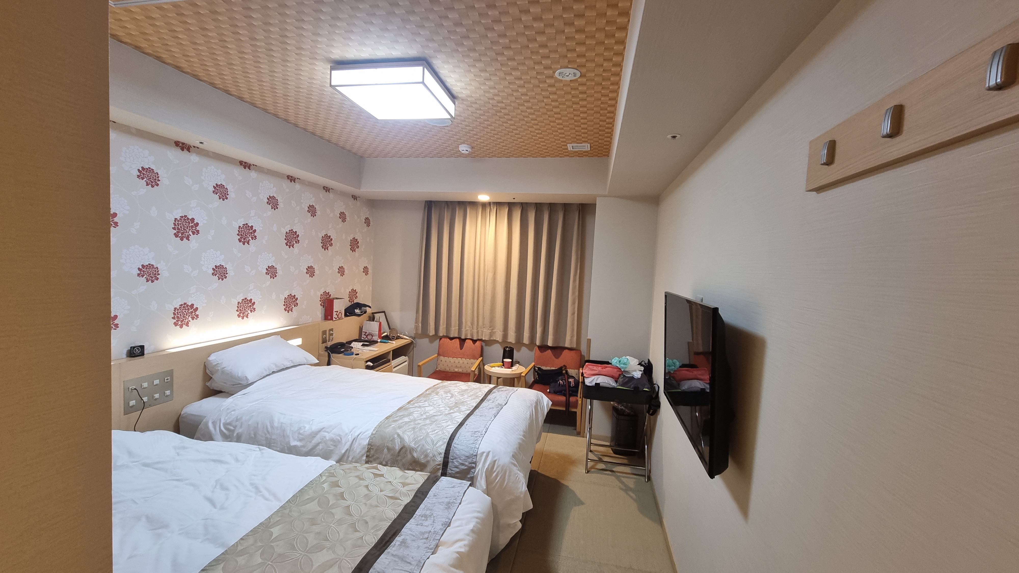 숙소는 더블, 트윈, 디럭스트윈, 트리플룸이 있습니다. 인근의 비즈니스 호텔과 일본의 보통호텔과 비교했을 때 다소 크기가 넓은 편입니다. 케리어를 놓고도 움직일 수 있을 만큼 충분한 공간이 나옵니다 아래는 직접 투숙한 트윈룸기준사진입니다.