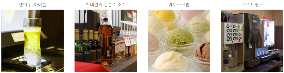 호텔 1층 식당에서는 무료로 술과 음료, 커피, 아이스크림, 라면 등을 먹을 수 있습니다. 술은 오후 3시부터 오후 10시까지 주스, 커피와 같은 음료는 24시간 무료입니다. 술 종류는 일본 소주, 아사이슈퍼드라이 생맥주, 사케, 위스키, 하이볼등이 무한 제공 됩니다.