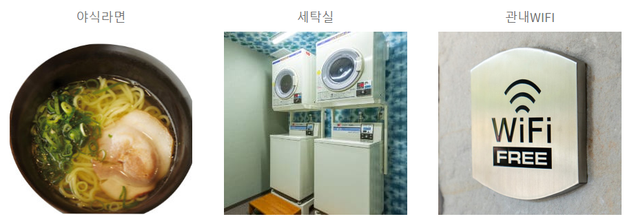 무료 일본라멘은 오후 9시부터 10시 사이 한 시간 동안 제공되면 무제한 가능합니다. 맛 또한 전문라멘집에 뒤지지 않는 맛입니다. 라멘의 종류는 매일 바뀌며 요일에 따라 다르게 제공됩니다. 이외에도 세탁실과 무료 와이파이 사용이 가능합니다.