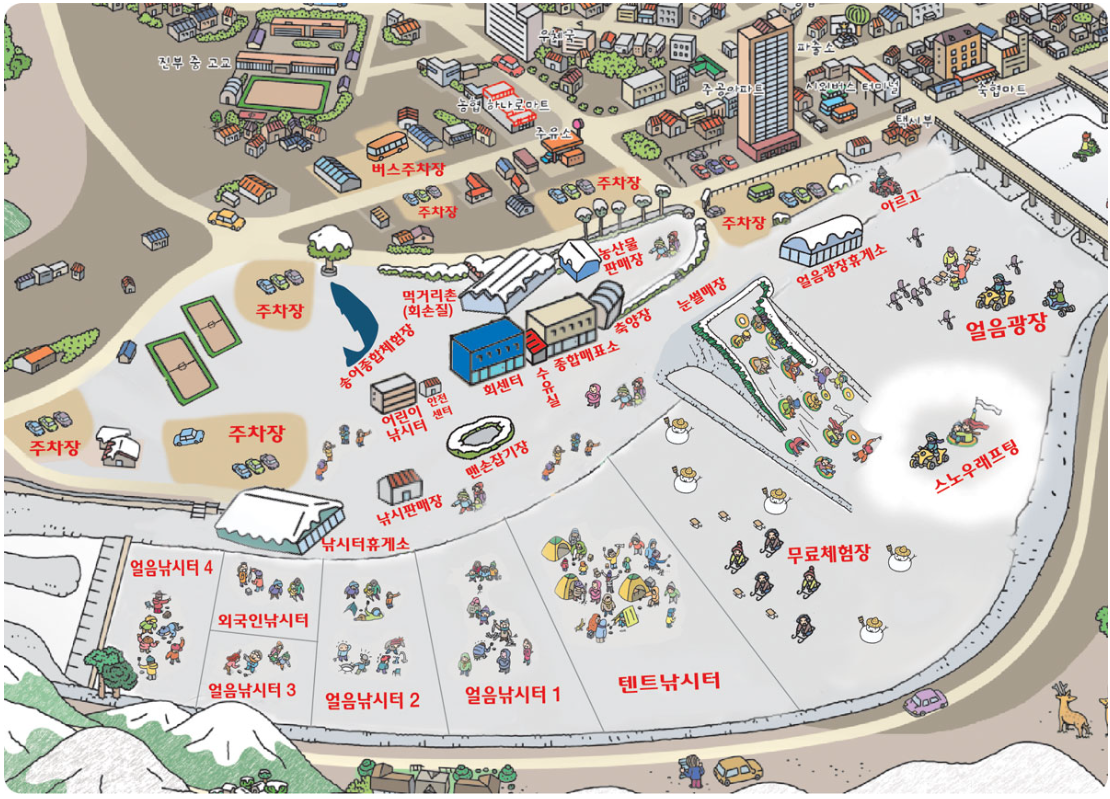 송어축제 텐트낚시,얼음 낚시, 실내 낚시, 맨손잡기 까지 겨울바람을 이겨야 송어를 잡는다. 민물생선의 귀족, 송어와 한 판 승부! ※ 개최 일정은 기후 사정에 따라 바뀔 수 있습니다. --> 놀이