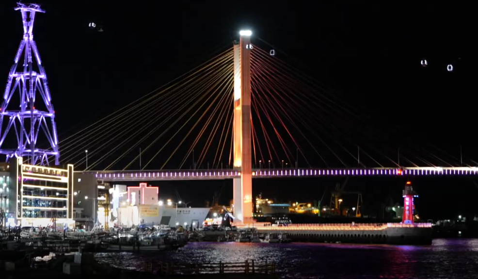 조용한 바다와 반짝이는 불빛이 어우러져 낭만적입니다.