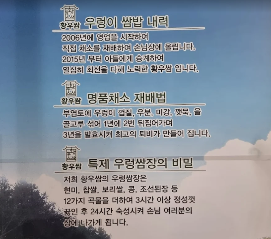 포항에서 건강하고 든든한 식사를 찾고 있다면, 황우쌈을 꼭 기억하세요! 신선한 쌈채소와 깊은 맛의 우렁쌈장으로 포항 현지인뿐 아니라 여행객에게도 입소문 난 포항 가볼 만한 추천 맛집입니다. 포항 해상스카이워크 여행 또는 울릉크루즈를 이용해 울릉도를 가시는 분들에게 출발 또는 도착 시 방문 강력 추천 장소입니다.
