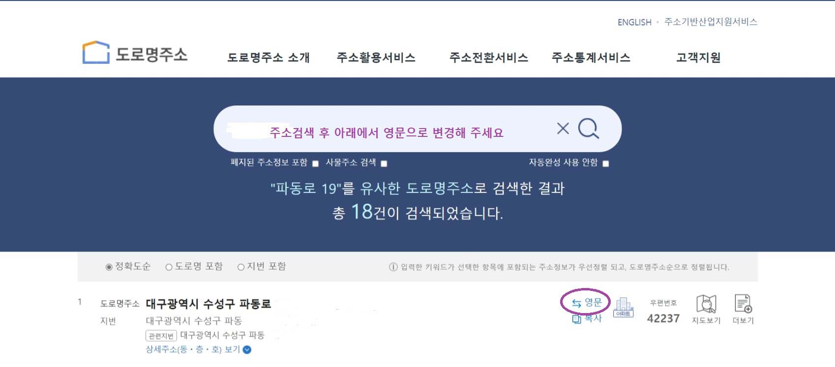 ▶검색된 주소에서 표시된 영문변경 부분을 누릅니다