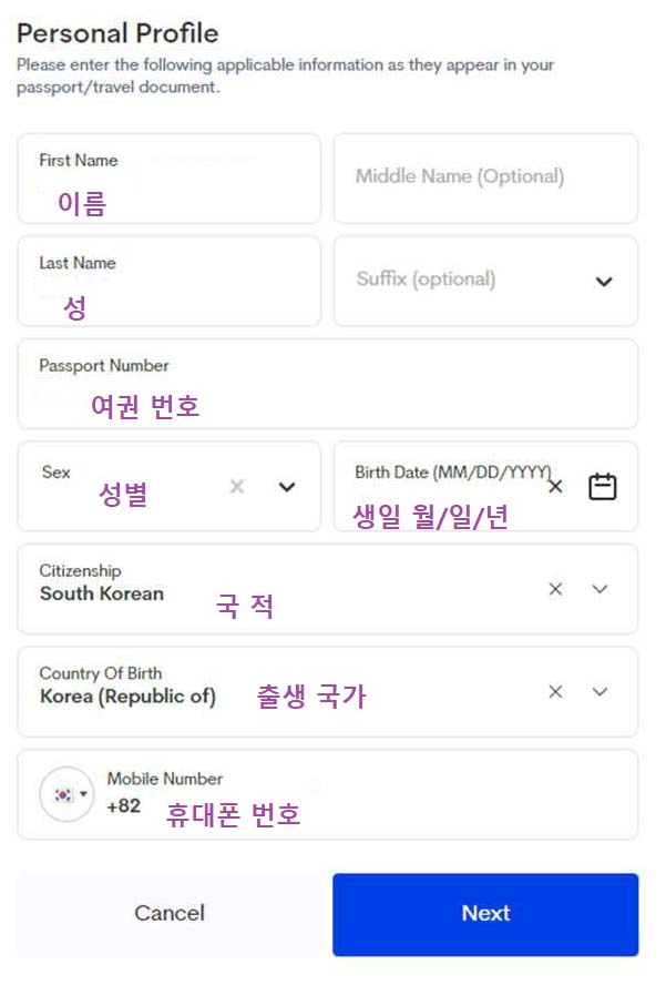 ▶여권상의 정보와 동일한 본인 개인정보를 넣을 차례입니다. 반드시 여권과 동일하게 영문 스팰링 넣어야 합니다. Middle Name과 Suffix는 체크하지 않으셔도 됩니다. Next 누르시고 다음으로 넘어가세요