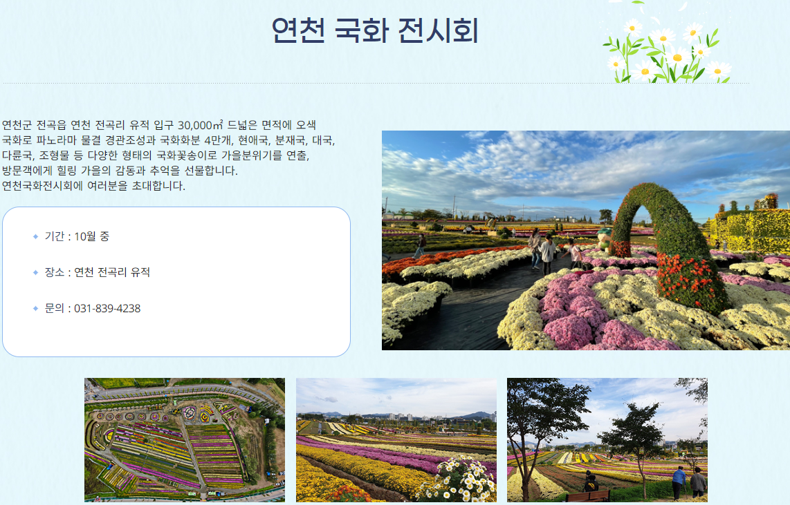 | 경기 | 연천 국화 전시회 | 10월 중 | 연천 전곡리 유적 |