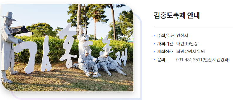 | 경기 | 안산 김홍도 축제 | 10월중순 | 화랑유원지 |