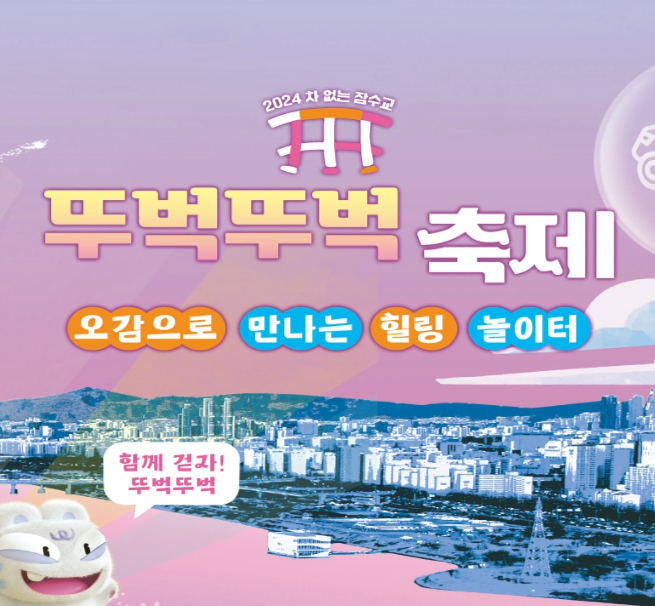 차 없는 잠수교 뚜벅뚜벅 축제는 축제기간 동안 매주 일요일 개최됩니다. 몸과 마음을 쉬어갈 수 있는 한강 위의 축제 놀이와 힐링을 동시에 즐기며 컬러풀한 한강으로 충전할 수 있는 축제입니다.